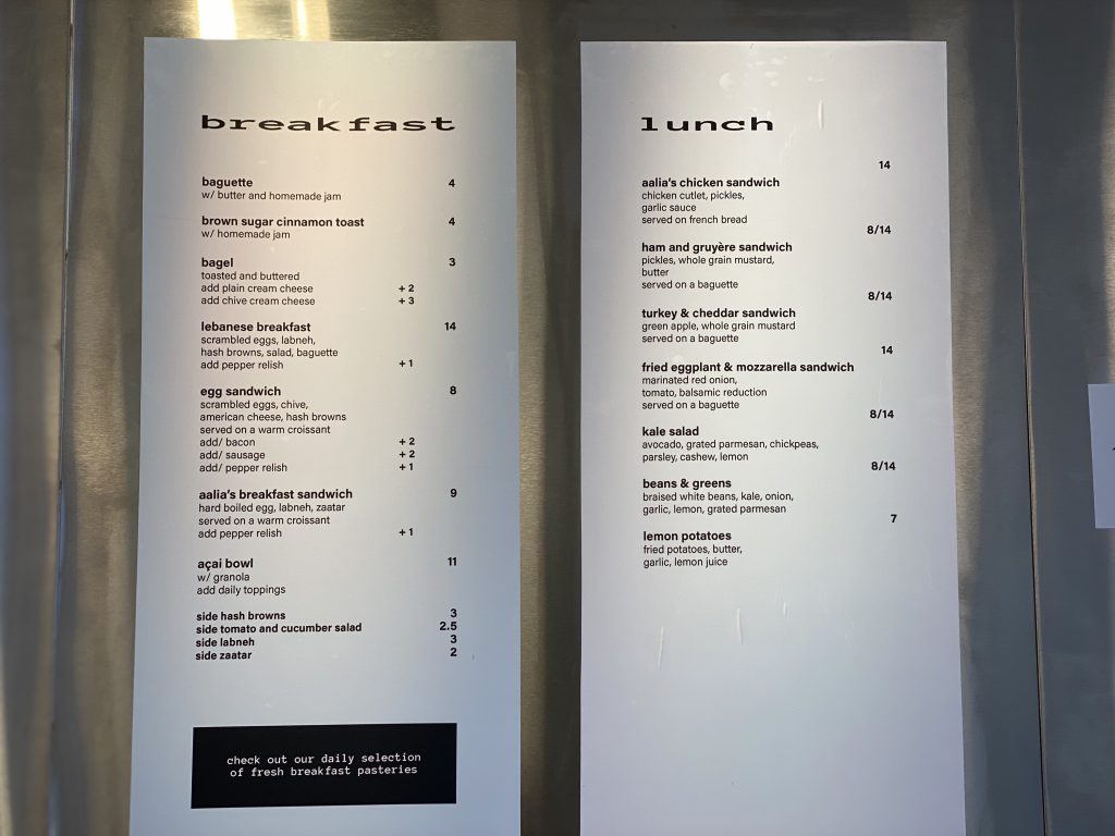 The menu is a mix of classics and items that are a nod to both owner’s heritage. Kelly is Italian and Joy is Lebanese. On the menu you will find things like Fried Eggplant & Mozzarella Sandwich, Kelly’s item and Aalia’s Breakfast Sandwich which has hard boiled egg, labneh (a type of cheese), zaatar (a spice), on a warm croissant.