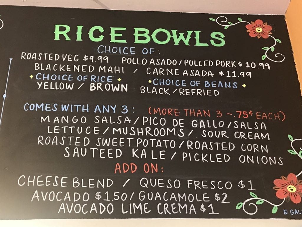 Dilly’s has three main options for your base meal – rice bowls, burritos, and tacos. The best thing is that you get to customize your meal. Choose your protein, there are vegetarian and fish options, and then make the magic happen. From Sriracha Aioli to housemade pickled onions to fresh roasted corn, you can build your dream taco. Pictured here is the Pulled Pork taco, note the Queso Fresco cheese – yum! You get two tacos for $10.99 but you do have to pay extras for some of the fixings.