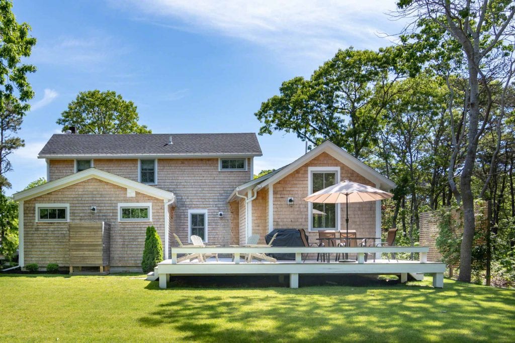 Idyllic Katama Beach House – This 3-bedroom, 3.5 bath home, 11 Plains Head Lane, Edgartown, offers an ideal location. Here, you can listen to the sounds of the ocean from this immaculate sun-filled Katama beach house with distant views of the Atlantic Ocean. Perfectly designed for indoor-outdoor summer living, the home features multi-level decks allowing nearly every room in the house direct access to its own outdoor deck area, which has been smartly furnished for dining, entertaining and/or relaxation.