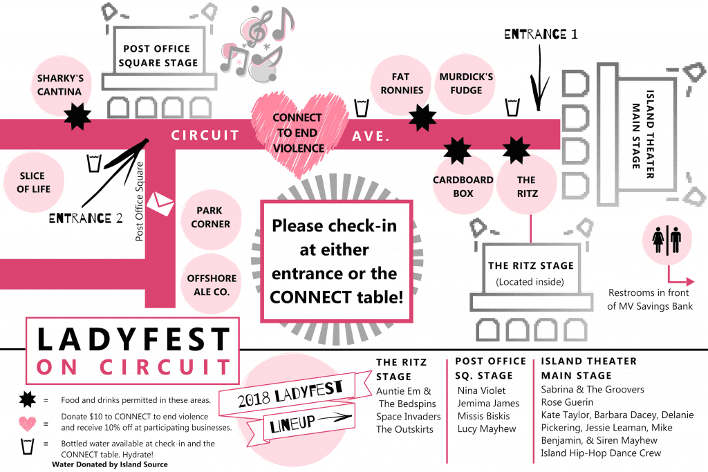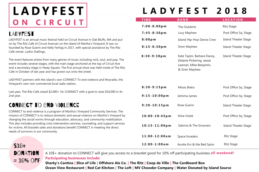 For a suggested donation of $10.00, proceeds going to a very worthy cause – CONNECT to End Violence, you’ll get a Ladyfest bracelet that give you all access to the music. It also gives you 10% off food at the restaurants that are helping make this event possible, like Slice of Life, Sharky’s Cardboard Box, MV Chowder CO, Offshore Ale and more for the weekend.