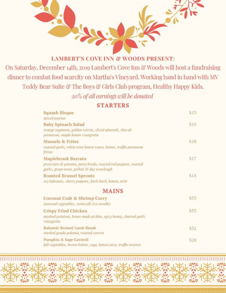 The holidays are a magical time of year on the Island. The community really comes together to celebrate the magic of the season, in every town! And this year, the Martha’s Vineyard Teddy Bear Suite Fundraiser takes a seat at Woods Restaurant at Lambert’s Cove Inn for a new dining twist on fundraising.