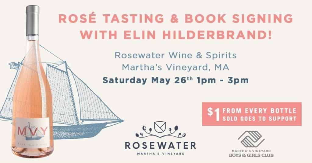 On Saturday, May 26th, Rosewater is hosting a MVY Rosé tasting and book signing with Nantucket author, Elin Hilderbrand. Sip and savor and meet this well known author of Summer beach reads Elin grew up Summering on the Cape and has lived in Nantucket since 1993. One of her novels, The Identicals is about twin sisters – one who grew up on Martha’s Vineyard and one who grew up on Nantucket – I bet this is a fun read!