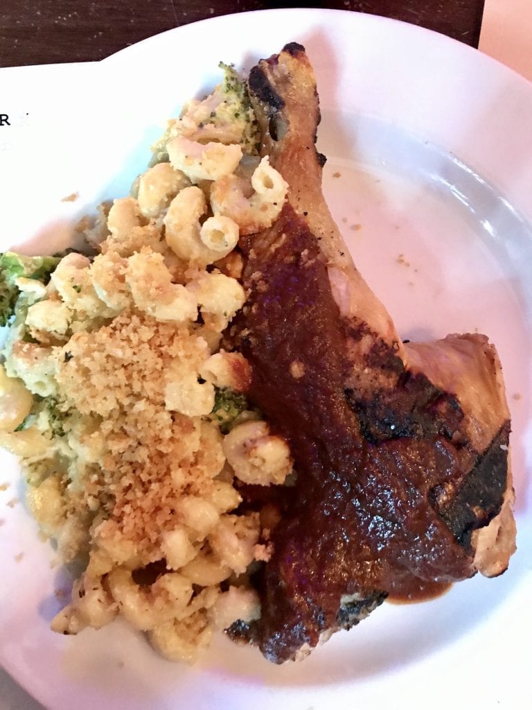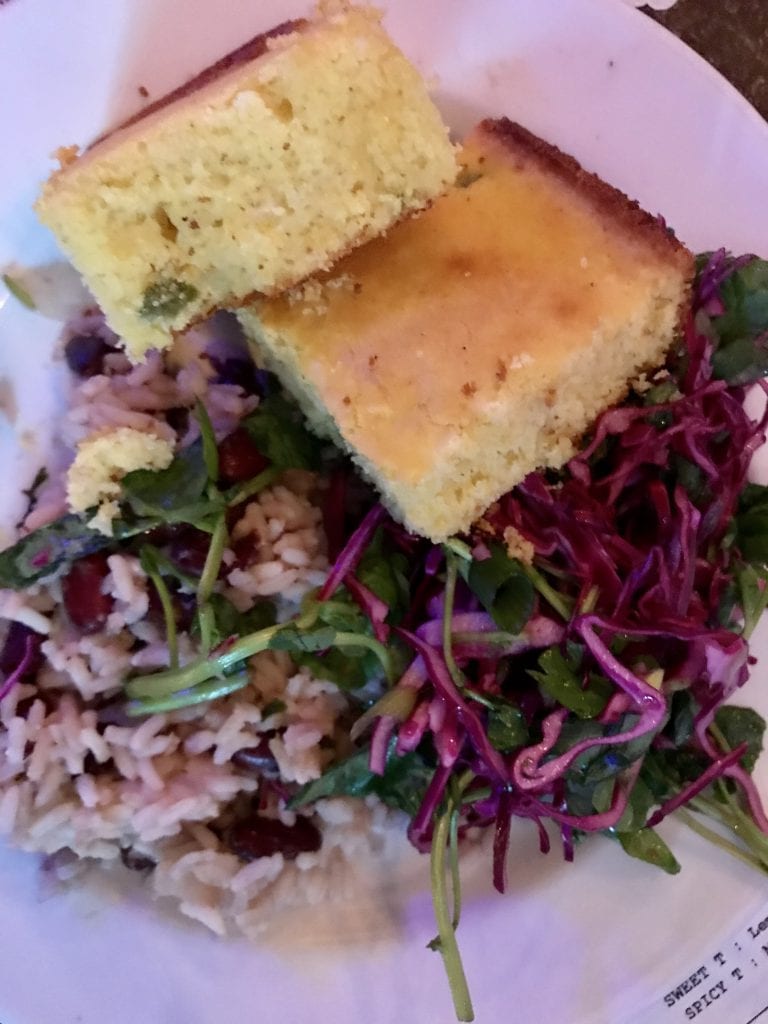 Ordering was simple. I was lucky enough to share with Katie and we pretty much sampled it all! We had the 1/4 BBQ Chicken with Roadhouse Sauce, the St. Louis Style BBQ Pork Ribs with Roadhouse Sauce, Red Beans and Rice, the Watercress, Scallion, Red Cabbage, and Cumin Slaw, Vegan Broccoli Mac, Jalapeño Cheddar Corn Bread and a big ole piece of the Vegan Almond Pound Cake. Sound like a lot? It was and boy did we enjoy our feast!