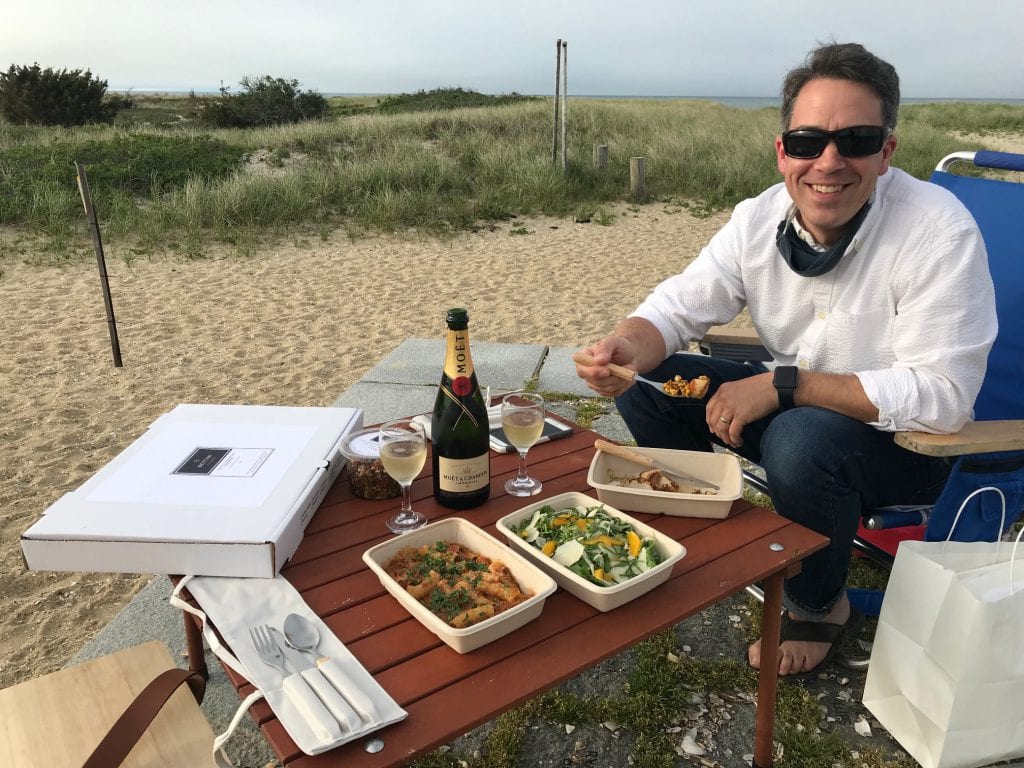 We packed our beach table, picnic basket, and chairs, and headed to Edgartown. When we arrived, our food was brought down to us. It was quite lovely to have this for curbside pick-up. Added bonus, my husband surprised me by adding a bottle of Moët. I do love my bubbles.