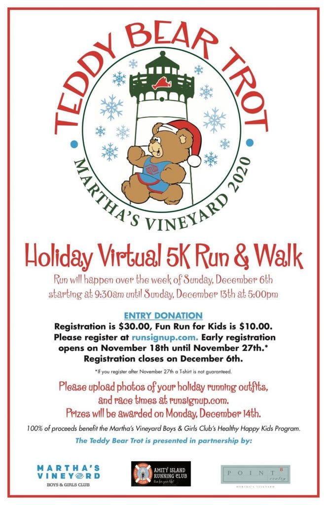- There is a suggested donation of $5.00 per participant, which goes to Point B’s Martha’s Vineyard Teddy Bear Suite fundraiser for the Martha’s Vineyard Boys & Girls Club.