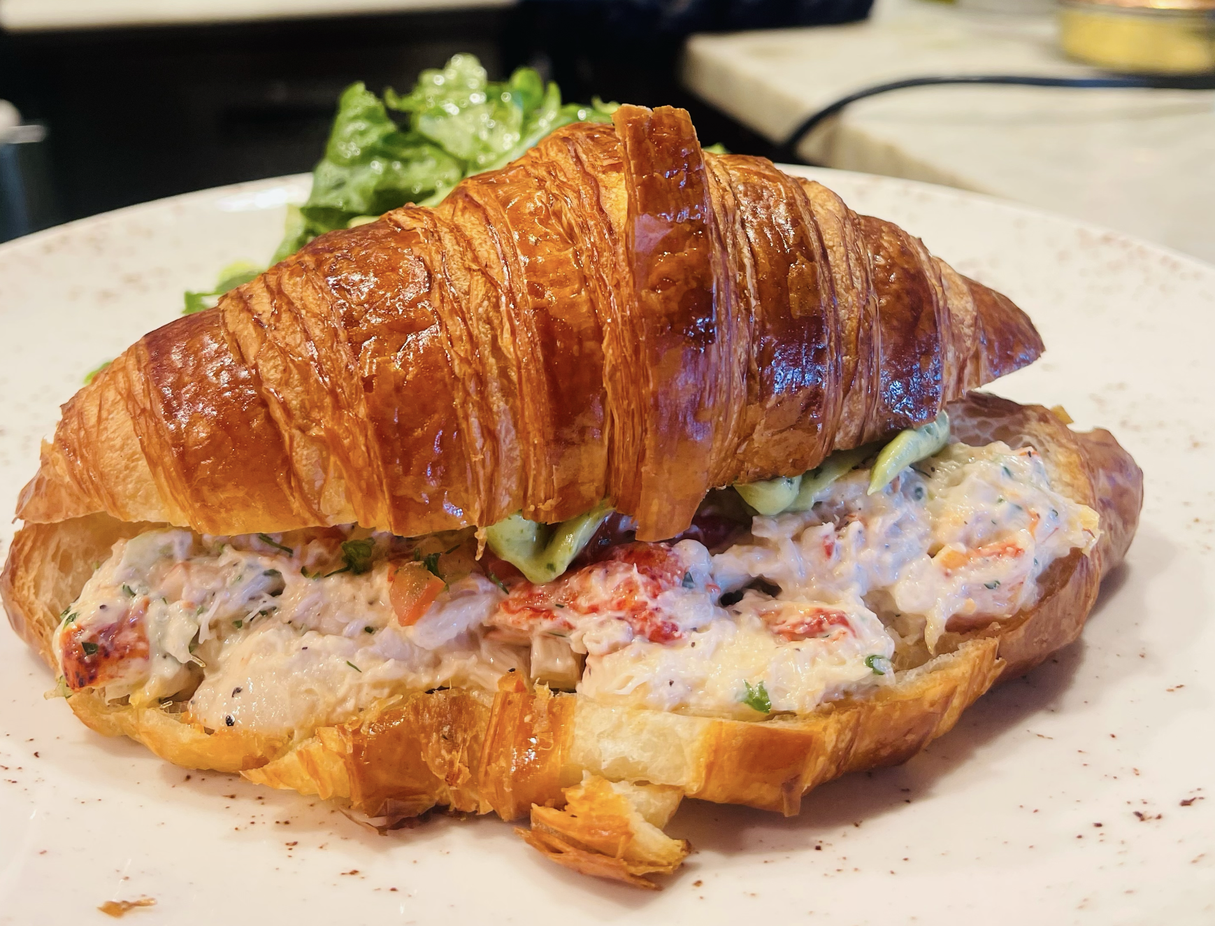 Atlantic Fish & Chophouse: Lobster croissant with avocado puree, tomato, and side salad ($25)